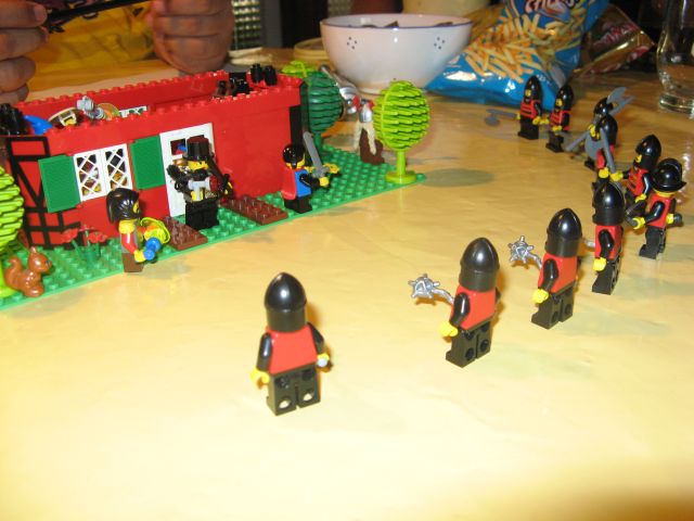 Die schäbigen Schergen hatten sich in einem Halbkreis um das Haus aufgestellt. Die edle Ronja und mein tapferster Turin kamen aus dem Haus gestürzt, weil sie meinen zwergenklar ausgestoßenen Warnschrei natürlich vernommen hatten. Wir stellten uns, mächtig beeindruckend, vor der Horde auf und warteten auf den Befehl des Königs.