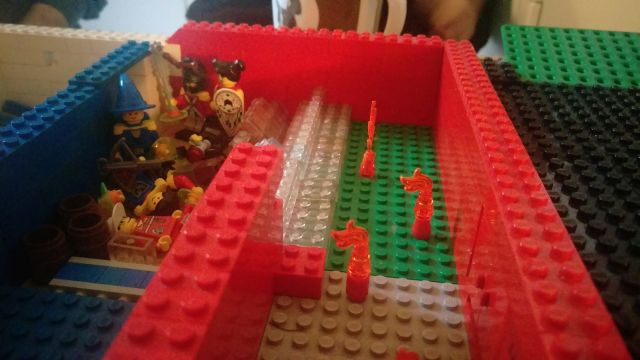 Aber Grmpf hat es irgendwann geschafft. Die Wand aus schlecht zusammengehaltenen Fensterscheibensteinen brach ein und zeigte uns den weiteren Weg zur Rettung der Kinder. (Genau, darum ging es ja eigentlich! Erinnert sich noch jemand?) Der nächste Raum war hölleheiß, Flammen und Feuer schossen aus dem Boden, der Decke und den Wänden. Zusätzlich war der ganze Raum widerlich antimagisch.