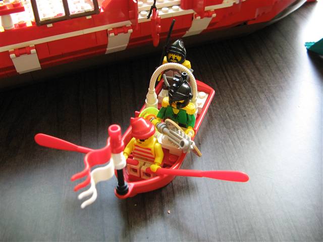 Gesagt, getan. Das Beiboot war schnell zu Wasser gelassen und der Matrose war auch schnell angelernt. Hier rudert er zwar noch in die falsche Richtung, aber was erwartet man von so einem jungen Spund?