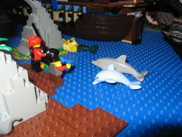 Da unser Konvoi natürlich (nach Aussage des Königs) nicht auf die Zurückgelassenen Höhlentaucher warten konnte waren die beiden zunächst einmal auf sich alleine gestellt, als sie diesen Höllenschlund wieder verliessen. Zum Glück erinnerten sie sich jedoch, dass sie ja jeder eine Signalmuschel von Toseidon in ihrem Handgepäck hatten. Ein schnelles Signal und wenige Minuten später kamen zwei freundliche Delphine angeschwommen, die beide ein sonderbares Zeichen auf der Flanke trugen: